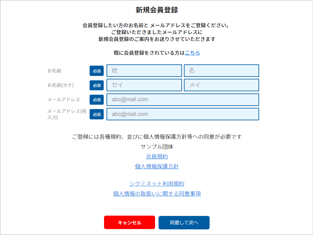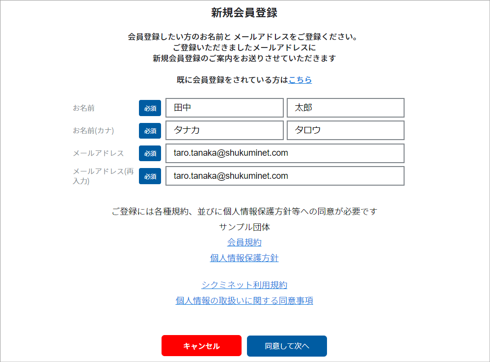 ②登録する「お名前・メールアドレス」を入力し、「同意して次へ」をクリックします。