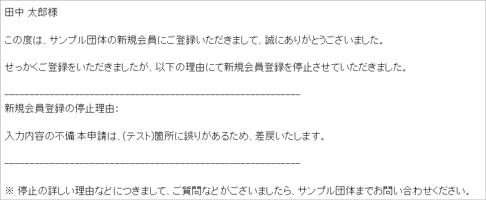 - 入会(新規登録)時の申請が否認されると、登録停止メールが送信されます。