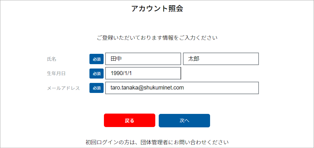 ②『アカウント照会』画面に遷移しますので、「氏名」「生年月日」「メールアドレス」を入力し、「次へ」をクリックします。
