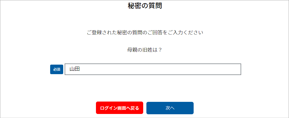 ③『秘密の質問』画面に遷移しますので、秘密の質問に対する「答え」を入力し、「次へ」をクリックします。