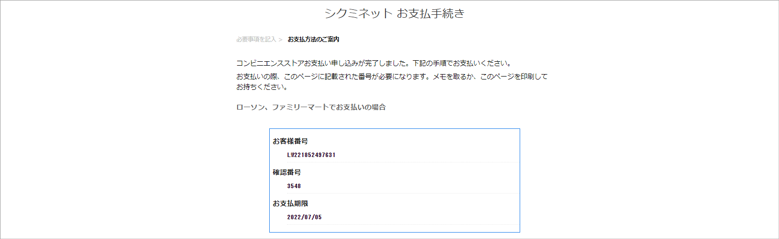 ⑤お支払いに必要な各種番号が表示されます。各種番号はご自身で控えてください。
