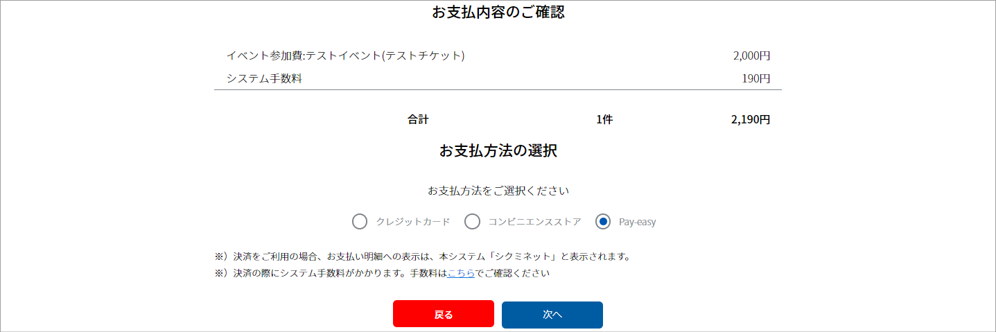 ②ラジオボタンより「Pay-easy」を選択し、「次へ」をクリックします。